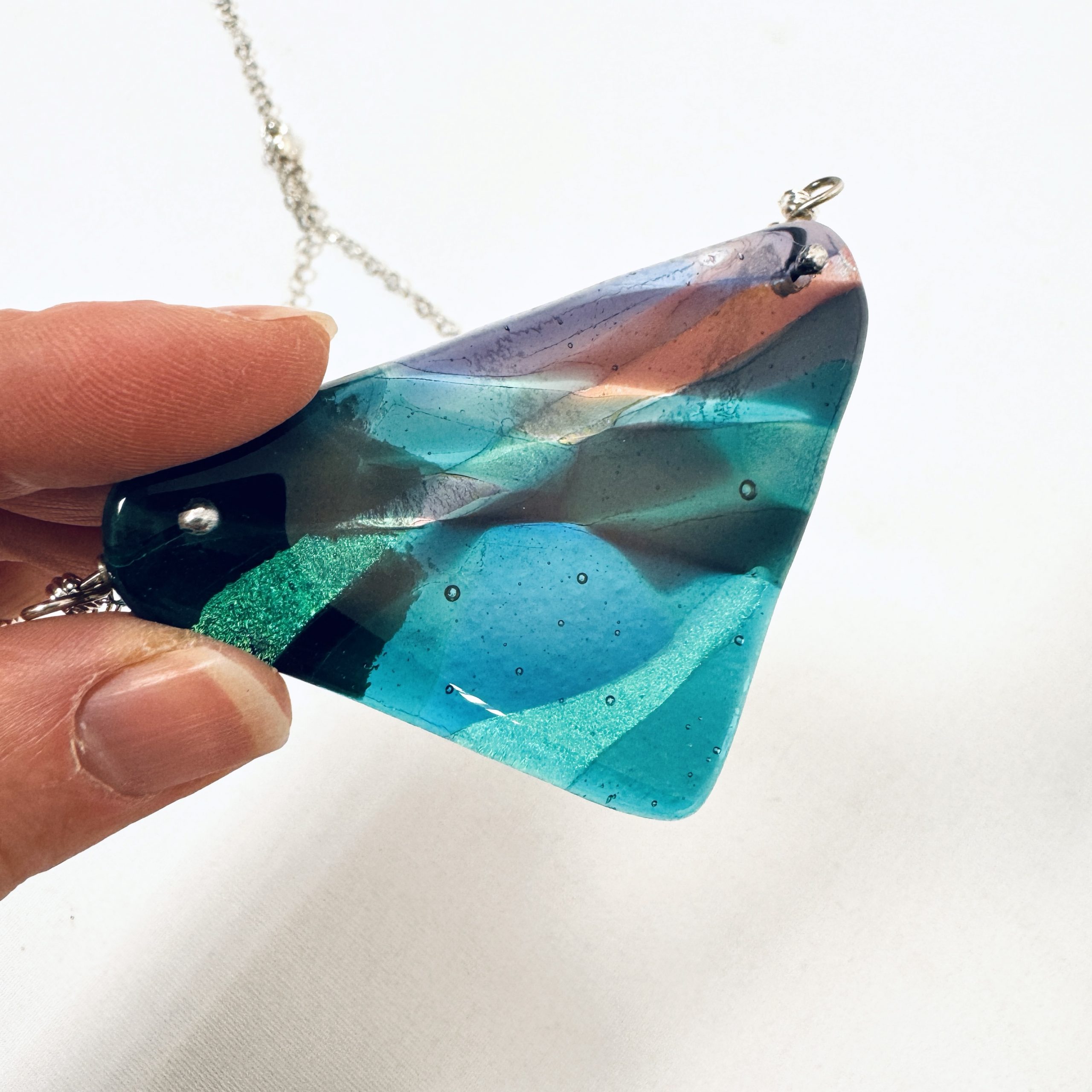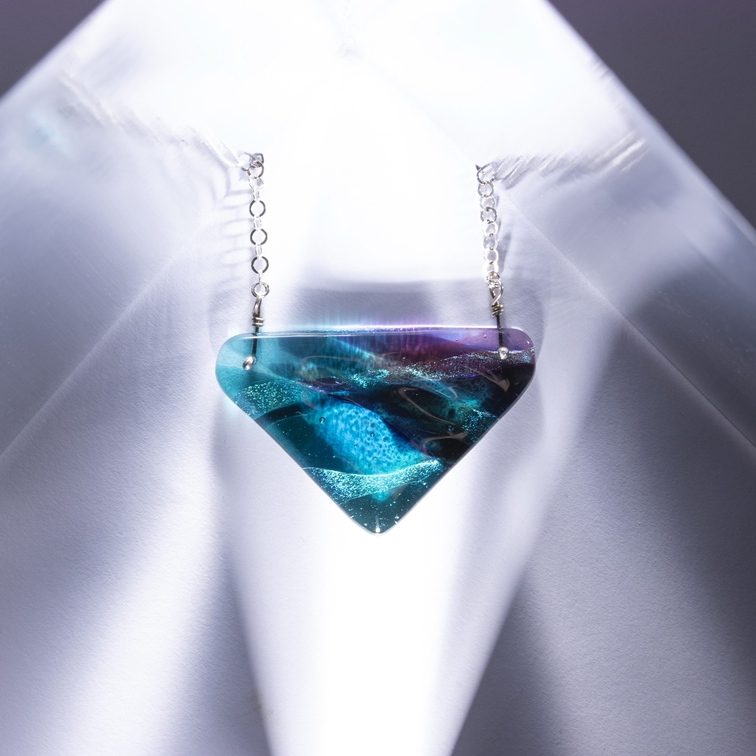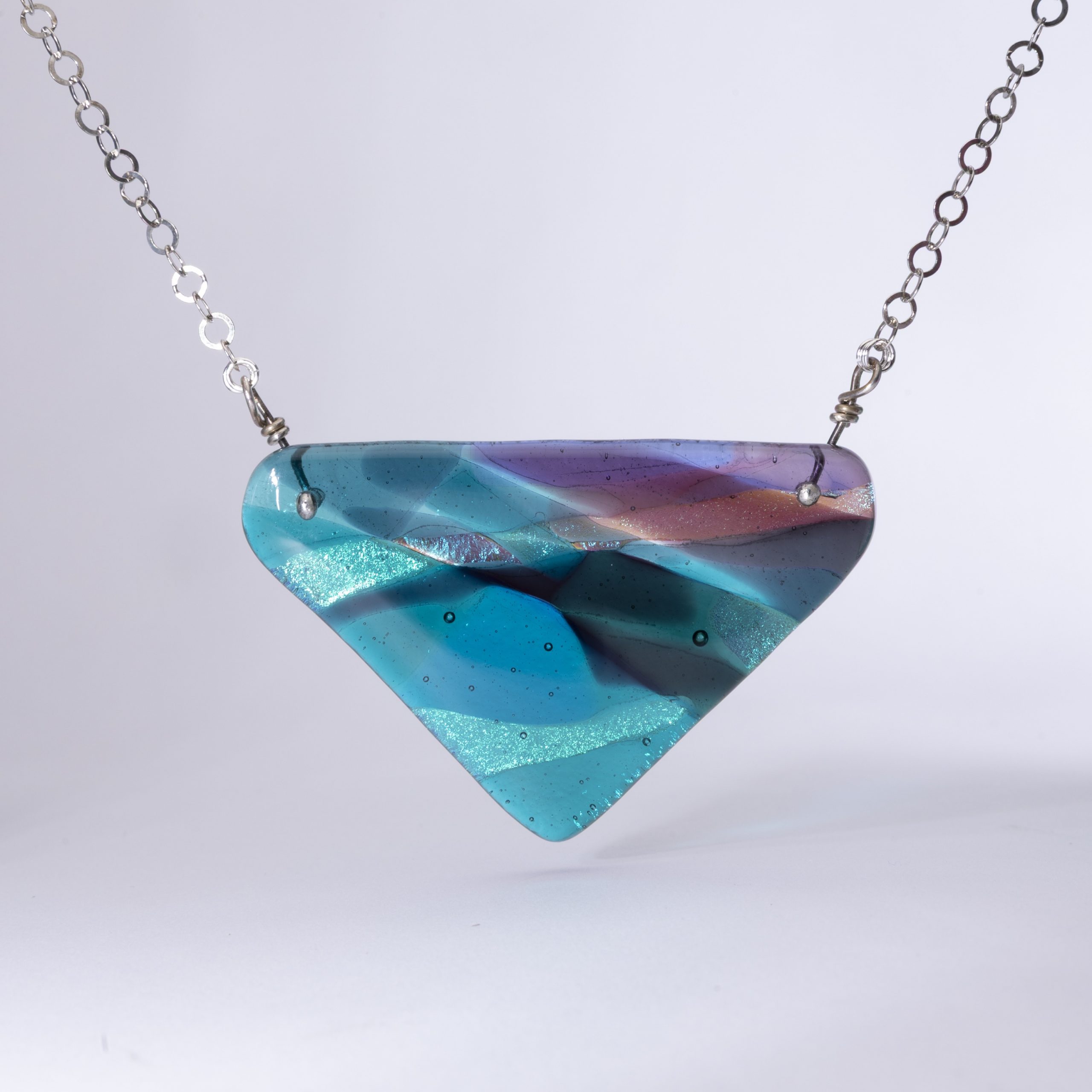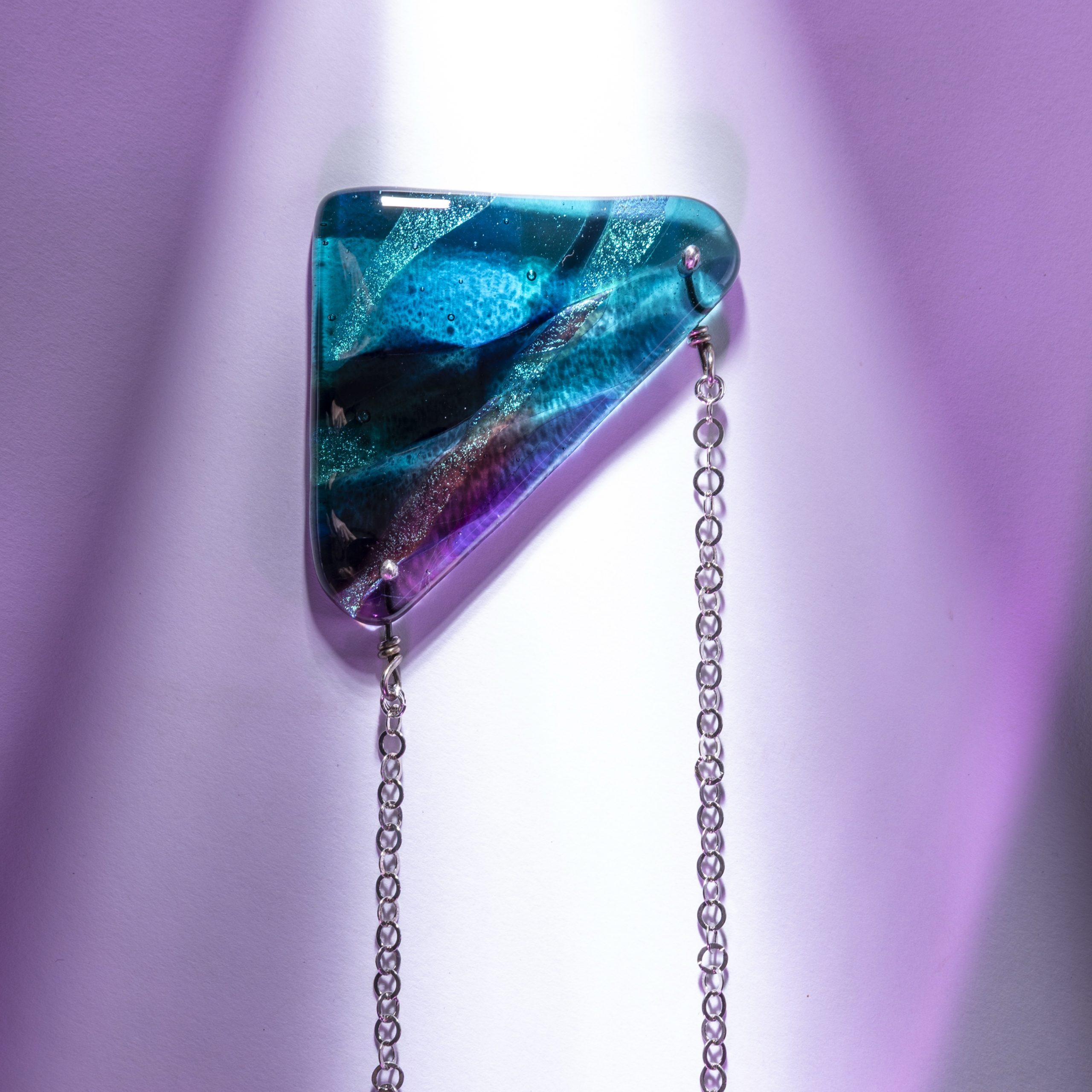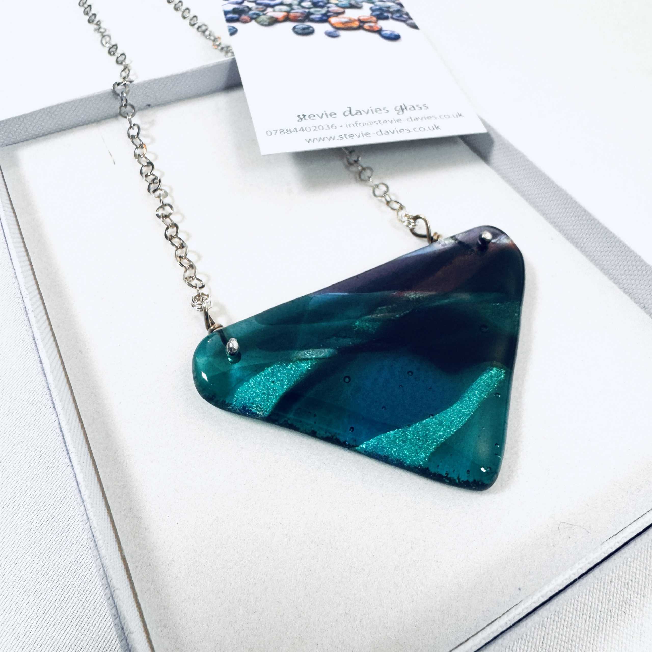 I love to create wearable art, especially one off statement necklaces with layers of colour and plenty of sparkle, all hand finished with Sterling Silver details. More of an Artwork than my other makes, each unique piece is influenced by the things I see, my surroundings, the photos I take while out and about and my interpretation of the environment into a fused glass form.
