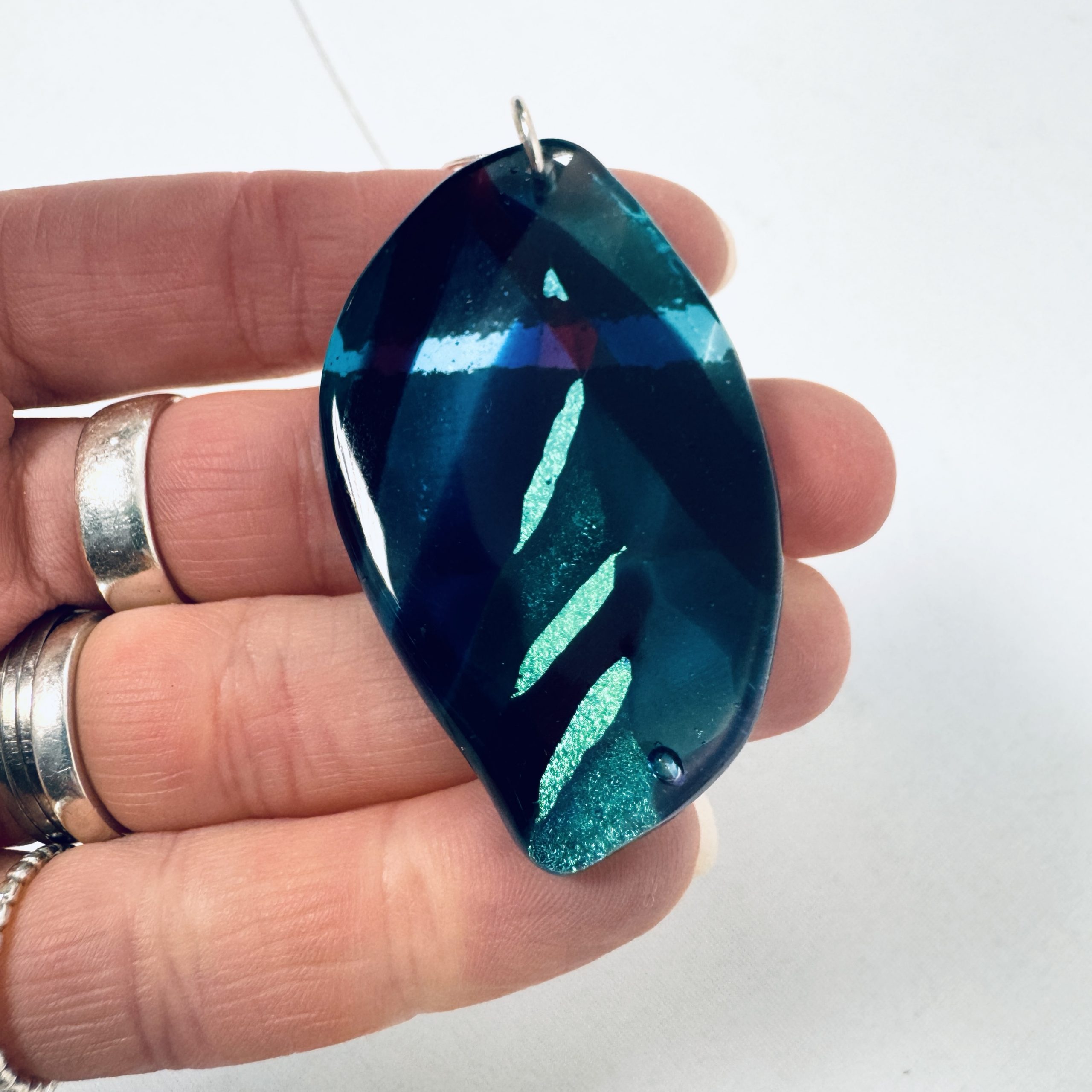 A dramatic colour mix, turquoise, peacock blue, pink and purple! With soooo much sparkle. Inspired by my idea of a rainforest, the colours of birds feathers in the shape of a leaf. I get to experience on my drive home through the Derbyshire landscape. This is a unique piece but I do have plenty more in my brick and mortar shop, if you are interested in other pieces with different shimmering tones of glass, please get in touch. I often send people photos and videos on Whatsapp and can work to commission to get you a bespoke piece in other colours, shapes or sizes. Just get in touch.